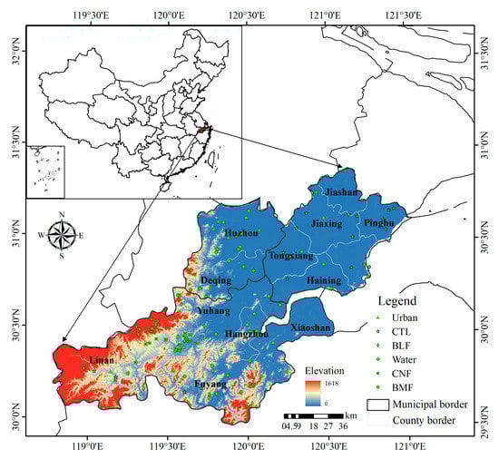 Hang-Jia-Hu region is located in the northern part of Zhejiang Province in China (Figure 1), ranging from 118°50’15’’ E to 121°19’6’’E and from 29°42’52’’ N to 31°11’53’’ N. Its climate is subtropical monsoon, and annual average temperature is 15~18 °C with an average annual precipitation of about 1100 mm. The study area is about 1.476 million hectares including Jiaxing, the majority of Huzhou and the northeastern part of Hangzhou. Specific regions include Linan (LN), Yuhang (YH), Jiaxing (JX), Jiashan (Js), Anji (AJ), Fuyang (FY), Pinghu (PH), Deqing (DQ), Hangzhou (HangZ), Tongxiang (TX), Hanning (HN), Haiyan (HY), Huzhou (HuZ), Xioashan (XS) and Changxing (CX). Forests in this place are mainly distributed in the southwest, and the main forest types are broadleaf forest (BLF), coniferous forest (CNF), and bamboo forest (BMF).