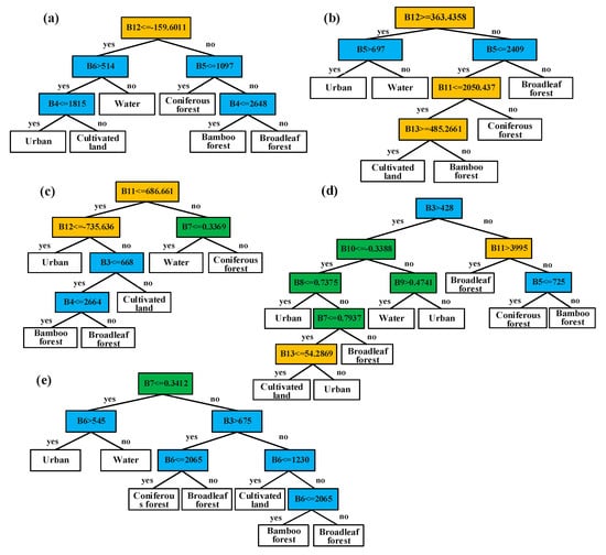 The various optimal decision trees indicate that there is a big difference among the variables and nodes threshold of segmentation in different years. Overall, the original bands are most of the variables used to build the decision tree, and the structure of the variables used by each tree varies greatly. Although images are processed to a uniform atmospheric correction, the difference in the time of image acquisition still have some effect, and there are also differences in the spectral image values of Landsat TM and Landsat OLI. Therefore, the values of the optimal characteristic bands selected when extracting forest information will be different. In Figure 2, with respect to vegetation, the original image bands and the first three components were mainly used to construct the rules from 1995 to 2009. In addition, B6 is the segmentation variable for discriminating the three forest types. B4, B5 and B6 are mainly used to extract bamboo forest from the other two forest types, especially B4, which divides it and broadleaf forest in 1995 and 2005. However, B7 (NDVI) seems to be more important in the segmentation of land types in 2015. This is mainly because of the formation date of the different images. NDVI, as the standard index for monitoring the growth state of vegetation, is able to separate them from other land types, and the vegetation in 2015 is growing in maturity, exhibiting a high value. As for urban and water, B5 and B6 are the core segmentation variables, and are prominent from other bands with different thresholds in different years.