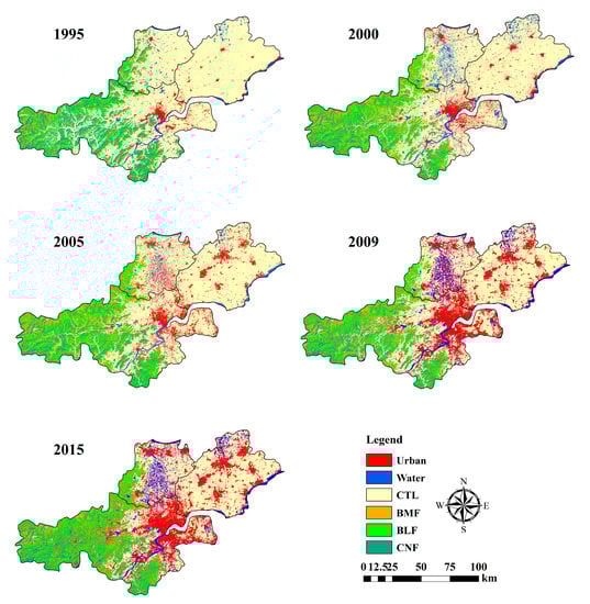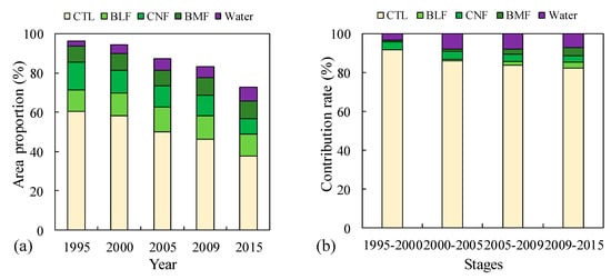 We analyzed the area change of land use in this study and its contribution to urban expansion (Figure 6). Based on the results, CTL, which is the main source of urban expansion, has led to a significant area loss over the last two decades. The trend of contribution rate to urban expansion decreased continuously (from 91.61% in the first stage to 82.23% in the final stage), but it remained the main source of urban expansion throughout the study period. BLF and BMF also showed an increasing trend in their contribution rate to urban area when it exhibited a small increase. The allocation of forest resources is always in dynamic balance. CNF, with the largest value, is the most likely source of urban expansion prior to 2009, but it also decreases in its contribution to the increase in urban area due to the decrease in area. In addition, BLF became the major source of expansion between 2009 and 2015. However, although the overall forest area decreased, its contribution rate to urban expansion gradually increased, which indicates that the probability of future urban expansion using BLF and BMF as sources of expansion will gradually increase. The changing factors of water bodies are more complicated. At the same time, due to the difficulty of transforming water bodies into urban areas, its area and the contribution rate to the increase in urban area has no obvious evolution to follow. Overall, the vegetation in this study observed strong laws regarding area and contribution rate to urban growth during the urbanization process. A sustained urban expansion with a certain land use type as a source of expansion will result in a significant decline in the land area. At the same time, this will also lead to a gradual decrease in the probability of becoming a source of expansion, thus exhibiting a reaction phenomenon in the process of urbanization.