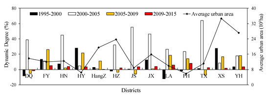 The urban area in Hang-Jia-Hu region changed considerably. The dynamic degree of urbanization and the average urban area from 1995 to 2015 in 13 districts are shown in Figure 4. The dynamics degree of different districts varied greatly. In most districts, after a small-scale reduction of urban area, there was a large expansion in the next stage. This may be because the demolition of urban areas and their subsequent reconstruction. During 2000 and 2005, the dynamics were larger than other stages, and were positive in all districts. Several districts with a relatively large urban dynamic degree were not major cities, but rather those with a smaller average urban area. This illustrates that expansion has a greater impact on districts with smaller urban areas. For example, HN, JS and TX have the relatively high dynamic of urban expansion that is beyond the amplitude in HangZ, JX and HZ. Moreover, even though there was a small decline in some districts in specific periods, there were still some where the urban area increased continuously. Dynamic degree in FY, HN, HangZ, JX, XS and YH were positive in the four periods, which means that the urban area in these districts was in a state of expansion.