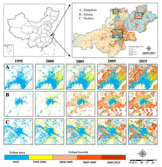 Spatiotemporal distribution of urban growth in Hangzhou (A), Jiaxing (B) and Huzhou (C) from 1995 to 2015.
