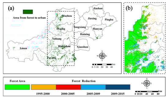 According to the statistics, the total amount of forests lost due to urban expansion was 19,823 hectares, which accounts for 71.05% of the total decrease in forest. This illustrates that urbanization is the major factor leading to the decrease in forests. Figure 7 reflects the spatial distribution of forest areas changing into urban areas (Figure 7a) and the specific changes in different stages (Figure 7b).