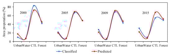 The forests in Figure 8 and Figure 9 include BLF, CNF and BMF. The area proportion in Figure 8 shows that the predicted area has a strong relationship with the classified area. The R2 between the classified area and the predicted area in 2000, 2005, 2009 and 2015 are in the range of 0.94 and 0.99, with RMSE ranging from 1.61 × 104 hm2 to 7.86 × 104 hm2. This means that the predicted results displayed a precise accuracy, which further illustrated that the ATPM could perform well when predicting land area from 2000 to 2015 and could be applied in the prediction of area use for the next 20 years.