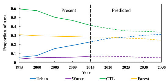 Based on the ATPM, we calculated the land use area from 2020 to 2035 and drew the overall area trend for the land use dynamics of the previous 20 years and the next 20 years (Figure 9). According to the structure of land use from 1995 to 2015, urban expansion is accompanied by an intense reduction in CTL and a slight decline in forest area. In addition, based on the prediction results from 2020 to 2035, CTL will continue to decline, although the magnitude of change will be relatively lower than before. However, the phenomenon of forest reduction will be more obvious than in the previous 20 years, especially in 2030 and 2035. This shows that urbanization will continue to reduce CTL as a source of expansion in the next 20 years, but the impact on forests will gradually increase. With this pattern, and considering no other external economic and social factors, urban expansion will continue to occur, growing more serious and leading to the large-scale occupation of CTL, causing greater area loss of forest.
