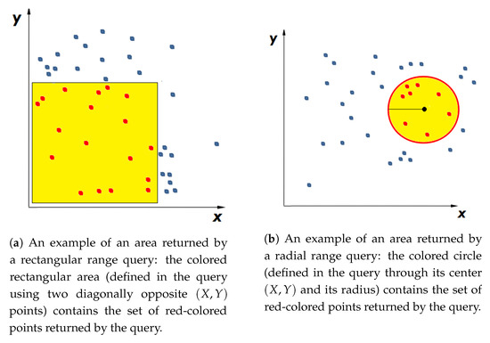 As for the MEDIUM (Figure 2) and LARGE (Figure 3) datasets, a range query was used to further restrict the results of point query to find only those points whose X-coordinate was . As for point query (Table 3), it simply finds those points that are associated with (natural terrain). For all three datasets, two range queries (illustrated in Figure 4) were tested, a rectangular query and a radial query . Both of these queries use the result set from query , in other other words, they are applied to only those points that belong to buildings. The radial query was so designed that for all three datasets, it would return a clearly smaller result set of points than query . Lastly, in order to get a feeling of how a point query that does not specify the semantic ID would fare, we ran an additional point query that retrieves a single point from the LARGE dataset as detailed in Section 4.3.