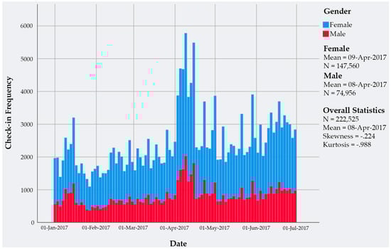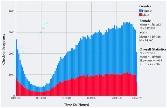 It can be seen in Figure 3 that on the time scale from midnight to midnight (00 to 24 h), the check-in frequency is more skewed towards the right, showing more check-ins in the afternoon, evening, and before midnight. The figure shows the normal distribution of the data, shown by the kurtosis having a nearly normal value of 3. There are less check-ins after midnight and in the early morning because of the sleeping routine of Shanghai residents. As one of the most developed cities of China, the check-in frequency of both males and females is almost the same, but the number of check-ins differs because of the different numbers of male and female users in our dataset. The frequency is normal until the afternoon because the people are mostly at work, and it increases as they finish work and as they meet their friends and families or visit places, before eventually decreasing for the night period.