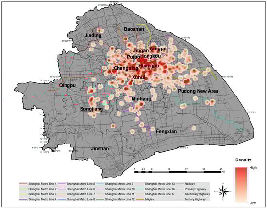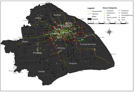 In this section, we investigate the spatial analysis by visualizing the location of check-in venue categories and the density of total check-ins by using the geo-location data from Weibo on a map of Shanghai. For this purpose, we used a map including features from OpenStreetMap, because it contains the most recent updates of the map features [65]. We can observe features such as city boundaries, districts and district boundaries, Shanghai Metro lines, and the road structure. With the help of these features, it is easy to evaluate and recognize the different locations on the map. For spatial analysis, we first plotted the locations of all the famous venues in Shanghai, as shown in Figure 6.