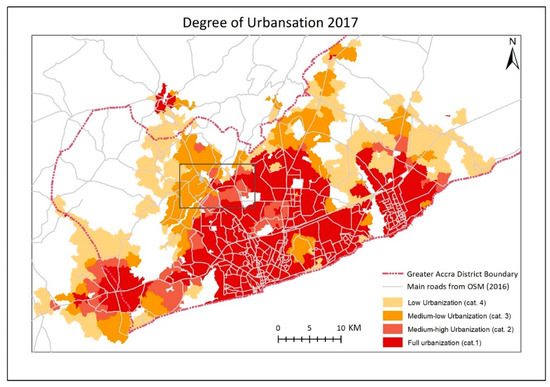 In Ghana, the definition of urban areas is somewhat different. According to the Ghana Statistical Bureau, Ghana has “over the years defined an urban area to include all localities with 5000 or more population”, and national censuses use this definition of urban localities [24]. The official definition of “urban” in Ghana is thus concerned only with population and not with any specific distance or density threshold of either buildings or population. In the case of the city of Accra itself, the population threshold of five thousand was surpassed many years ago, and the delineation of Accra’s “statistical” boundaries therefore mainly seems to be a question of assessing the density of housing or population in an area. Since density is not included in the applied definition of “urban”, the question is how the spatial delineation of urban areas has been handled so far in official statistics and maps. This is not made explicit in any reference text, but it is assumed to be based on visual assessments. It is reasonable to assume further that the recent sprawling urban development in many parts of Ghana, especially in the Accra area, and the resulting blurred boundaries have made the “statistical” boundary between rural and urban areas much more difficult to determine visually compared to what was the case previously.