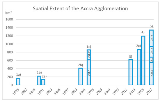 Area figures for the Accra agglomeration reported by five different studies. (1a), (1b), (1c) Landsat-TM texture [26], 1985 and 1991. (1c) Landsat-TM texture 2002, Category 1: “urbanized areas” and Category 2: “areas under conversion”. (2a), (2b), (2c) Atlas of Urban Expansion [12], 1991, 2000 and 2014. (3) Global Urban Footprint [27], 2012. (4) AfricaPolis [28], 2015. (5) Visual inspection of segments (prepared for this study), 2017. Category 1: “full urbanization”, Category 2: “medium-high urbanization”, Category 3: “medium-low urbanization” and Category 4: “low urbanization”.