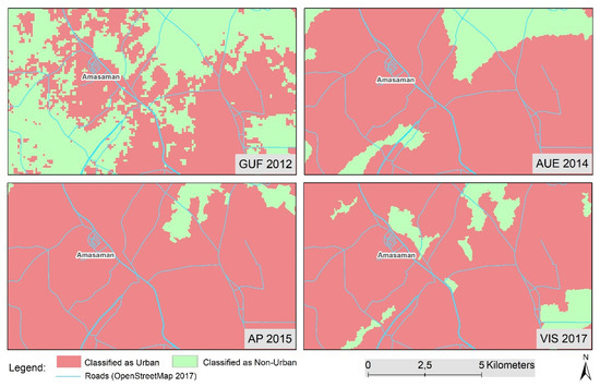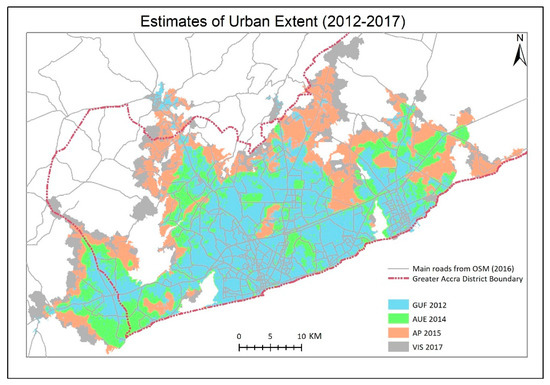 Akubia and Bruns [17] reports an urban extent for Accra of 411 km2 in 2008 and 689 km2 in 2017 based on the analysis of Quickbird/Worldview-2 imagery. Although none of the analyzed maps in the current study reports the urban extension in 2008, it seems clear that both values are considerably lower than what is found by the examined studies, which may indicate a narrow definition of “urban” and/or, especially for 2017, the fact that the study area is confined within administrative boundaries.