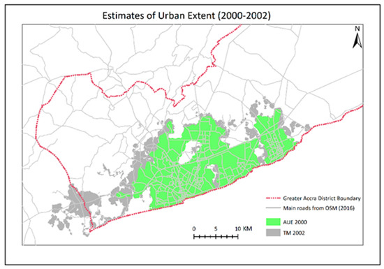 Estimates of the spatial extent of the Accra agglomeration for the period (2000–2002). Contributing datasets: Atlas of Urban Expansion (AUE) and Landsat-TM texture (TM). Road network from OpenStreetMap 2016 (https:/www.openstreetmap.org).