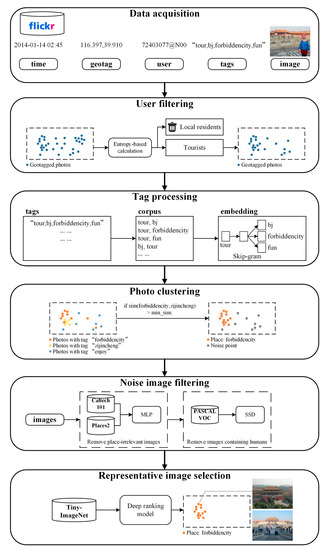 Given the challenges described above, in this paper, we propose a framework that combines an improved cluster method and multiple neural network models to extract representative images of tourist attractions from Flickr. We first modified the density-joinable cluster [20] by adding the constraint of time and user threshold, which aims to detect place-relevant tags and simultaneously filter some tags related to temporary events occurred in a fixed place or frequently used by one user. Then considering the existence of alternate spellings of place names, we further merge and extend these tag-based clusters according to both spatial relationships among clusters and semantic similarity among tags. The semantic similarity is obtained from the cosine similarity of Word2Vec embeddings of tags, because Word2Vec can make words get closer in the semantic distance and be more applicable to calculate the similarity of different text granularities [21]. Based on the cluster results, we filter the noisy images with objects by Multilayer Perceptron (MLP) and those with humans by a single-shot multibox detector (SSD) model [22]. Then the similarity of the filtered images is ranked by the deep ranking model [23], returning a ranked location list with representative images. We choose Beijing as the study area. The results of the proposed cluster methods and those of the existing methods are compared in clustering number, clustering accuracy and semantic distinctiveness, and the results of representative images selection are analyzed qualitatively. Additionally, a questionnaire is also conducted to evaluate whether the overall results meet the satisfaction of tourists in real life. A series of achieved results demonstrate the effectiveness of the framework.
