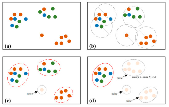 Photo clustering includes place tag extraction, merge, and cluster extension. The process of place tag extraction and merge begins with arbitrary tag that is not yet processed. If the number of photos containing tag (given as ) is less than the minimum number of photos then the tag will be marked as a noise tag and continue to process the next tag; otherwise, cluster the photos with TU-DJ-Cluster. It is a modified density-joinable cluster method [20], which is further constrained by a time threshold and a minimum number of users and is specific to geotagged photos. The main process of TU-DJ-Cluster is illustrated in Figure 2: (a) extract all points with the same tag as the clustering dataset per time, where different colors represent photos taken by different users; (b) calculate the neighbourhood of each point within a radius of ; (c) mark points with no neighbourhood as noise points, and join those points with at least one common point; (d) after generating an initial cluster result, further judge whether each cluster meets the conditions of the minimum time threshold and minimum users. If not, mark them as noise points.