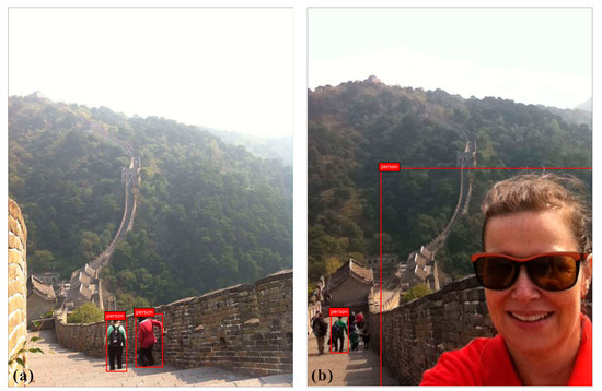 Next, we apply a single-shot multibox detector (SSD) model [22] to detect persons in images. It is a convolutional-based object detection model, pre-trained on PASCAL Visual Object Classes (VOC) dataset. We assume that if a more substantial proportion of an image is occupied by at least one person, it is more likely to be a tourist’s selfie in front of a tourist attraction. Examples are shown in Figure 3. Although both images show the same tourist attraction (The Great Wall in Beijing, China) and are both detected to have two persons, Figure 3a seems more likely to be the representative image for this tourist attraction than Figure 3b. Given this assumption, we detect each image and filter it if there is a person whose minimum bounding rectangle’s area covers over 10% of this image.