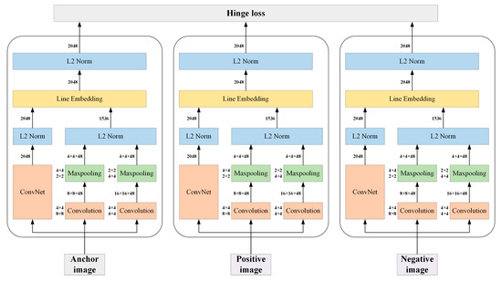 After removing noise photos, we train a deep ranking model and find the most representative images of each tourist attraction. The deep ranking model is a convolutional model focusing on fine-grained visual similarity, which is different from most existing models that only focus on category-level similarity [23]. As shown in Figure 4, the model can integrate a commonly-used convolutional network (ConvNet), such as VGG nets [45] and ResNet [46] with low-resolution paths and normalize their output features. Image triplets, including anchor image, positive image, and negative image, are fed independently into three networks with the same architecture and shared parameters. These embedding outputs of the inputs are leveraged to evaluate the hinge loss, by back-propagating the gradients to the lower layers to optimizing their parameters and minimizing the hinge loss.