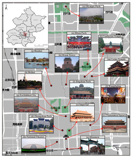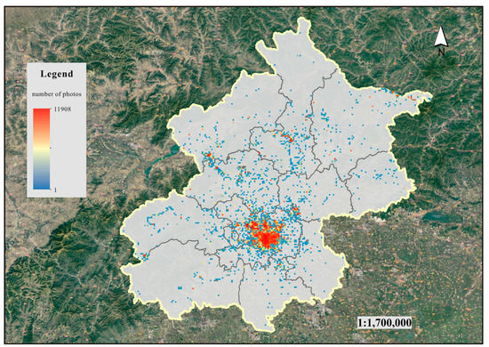 We select Beijing as the study area to verify the framework. Beijing is the capital of China, and also the second-largest city in China. It has abundant tourism resources, and every year it has attracted many tourists at home and abroad [48]. The number of raw images bounded in Beijing is 145,397, and the number of users is 2,846. After filtering users, as Section 3.3 described, the number of images has reduced to 140,891, and the number of users is 2,750. Figure 5 has shown photo distribution in Beijing.