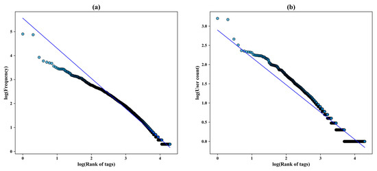 Log-log plots of tags used in the study: (a) Log-log plot on the frequency distribution of tags. (b) Log-log plot on the number of users using these tags.