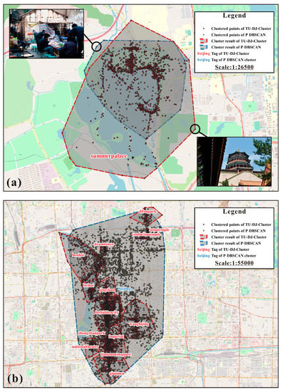 The comparison of results of TU-DJ-Cluster and P-DBSCAN: (a) Summer Palace; (b) area around the Forbidden City (The photos in Figure 9a are licensed under the Creative Commons Attribution License).