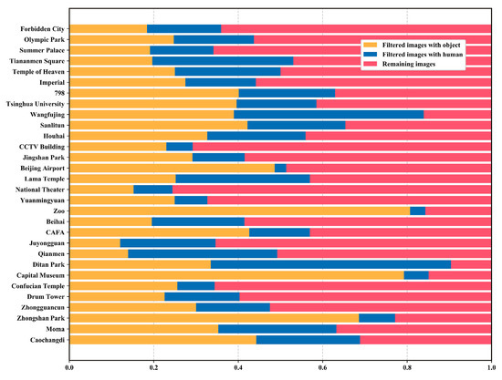 Based on the above cluster results of TU-DJ-Cluster, we further collect the corresponding images in each cluster to filter and find representative images. We exhibit the overall filtering result of each cluster with a stacked bar chart in Figure 10 and Figure 11. Figure 10 is the absolute number of images, and these tourist attractions are sorted by the total number of images, which reflects the popularity of each tourist attraction to some extent. As Figure 10 shows, the Forbidden City is the most popular tourist attractions, since the number of images far exceeds others. The following are the Olympic Park, the Summer Palace, and Tiananmen Square. Figure 11 shows the proportion of different types of image contents. Capital Museum, Zoo, and Zhongshan Park attract tourists mainly by historical relics, pandas, and tulip, respectively. Tourist attractions like them have a relatively high proportion of images related to objects. This result indicates that tourists are more fond of taking photos of objects when visiting these types of tourist attractions. On the contrary, images with humans are dominant in tourist attractions, such as Wangfujing and Ditan Park. Regarding Wangfujing, it is easy to explain because it is a shopping area with a massive flow of people. Ditan Park equally attracts tourists by its vibrant temple fairs, and thus, has many images containing humans. In addition, the chart indicates that tourist attractions with magnificent appearance can appeal to tourists to take more overall photos of them because images related to scenes account for over 60% with tourist attractions like CCTV Building, National Theater, and Yuanmingyuan. To sum up, tourists do show different preferences when taking photos of different types of tourist attractions, and the difficulty of representative image selection also varies from different types of tourist attractions.