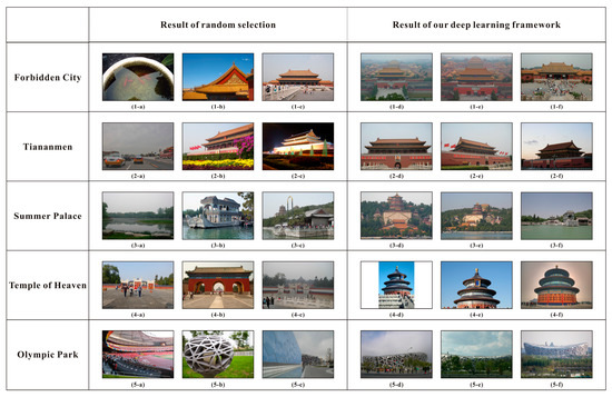 We select the top five tourist attractions which have the most number of photos and analyze their results of representative image selection. We compare the result of our representative image selection framework with that of random selection (without noise image filtering process), shown in Figure 12. We can infer from the random selection result that the image set biased- or non-representative photo perspectives (2-a and 5-c in Figure 12 for instance), local parts of this tourist attraction (1-b and 3-b in Figure 12) and even some noisy images (1-a and 5-b in Figure 12). In addition, although the noise image filtering process has been done, some unrelated images still exist, which increases the difficulty of ranking and selection for the deep ranking model. Our framework can still select the images taken from the most common and representative angles of view with the overall look of a certain tourist attraction. Although some representative images show the visual diversity, they reflect the diverse visual preferences of different users to some extent. For instance, different from the other representative images, 1-f and 3-f in Figure 12 show one of the Palaces in the Forbidden City and Marble Boat in the Summer Palace, respectively.
