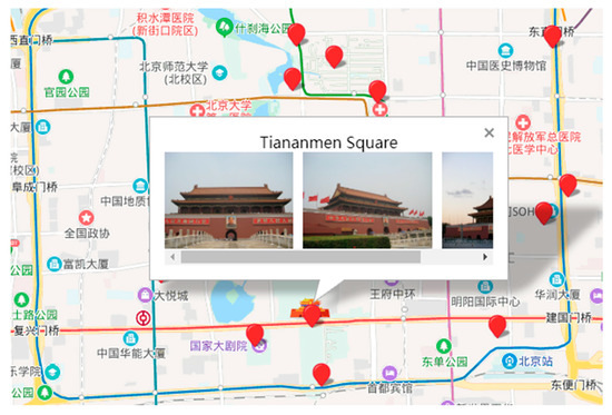 For better evaluating the overall framework results, we conducted a questionnaire based on the simple tourist map we created, where Baidu Map is the base map and extracted tourist attractions’ locations, and representative images are shown (Figure 13). Eighty volunteers participated in the survey, including people who lived in Beijing, have visited Beijing before, or are potential tourists to Beijing in the future (Note that most tourist attractions in Beijing are famous enough, and therefore, most people in China are familiar with them to a different degree). According to the tourist map, each volunteer rated three items based on a Likert scale from 1 (strongly disagree) to 5 (strongly agree), including: (1) Integrity: To what extent do you think the extracted results can cover Beijing’s famous tourist attractions (Q1); (2) representativeness: To what extent do you think the selected images represent the tourist attractions (Q2); (3) attractiveness: To what extent do you think adding representative images can attract you more to visit the tourist attractions (Q3).