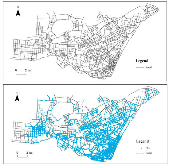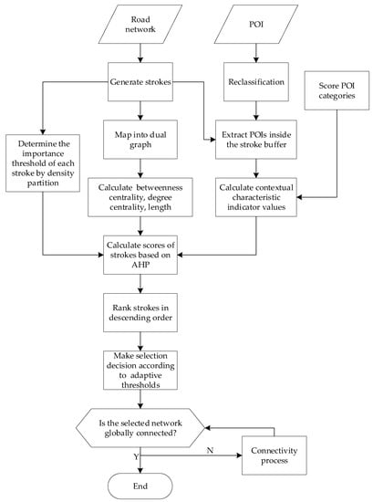 15]. In this method, several neighboring road segments are grouped into a stroke, which is then treated as a unit in the selection process. This concatenation mode is widely used in line-based methods and line-mesh methods due to its superiority in maintaining the longitudinal hierarchy and geometric features of the original network. In addition, with the development of volunteered geographic information (VGI), methods that employ big data have come into being, thus widening the clues and perspectives of road selection studies. Points of Interest (POIs)have been adapted in recent years to regulate road selection. Xu et al. developed parameters such as POI density and the ratio of significant POIs around a road to reflect the contextual characteristics of roads [