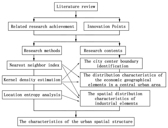 Additionally, more innovative research can make up for the shortcomings of existing studies for the following reasons. Firstly, the basis data are innovative. POI data can represent the spatial distribution of the intensity of socio-economic activity and functional composite utilization, which have an important application value for the study of the urban internal spatial structure. Secondly, the research methods are innovative. Although the nearest-neighbor index, KDE and location entropy are also used in the existing relevant researches, only a single method is used to analyze the problem. Especially, in this research, POI data and three methods are all used at the same time to analyze the problem of urban spatial structure from different perspectives, which also confirms the research results obtained by different methods, and then the reliability of the research results is ensured. Thirdly, this is reflected in innovations in the research perspective. Through the quantitative measurement of the industry’s spatial pattern, the city’s internal spatial structure is measured from the perspective of the industrial agglomeration’s distribution, which is different from previous studies of urban spatial structure that are mostly oriented to a macro interpretation.
