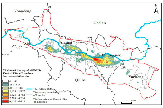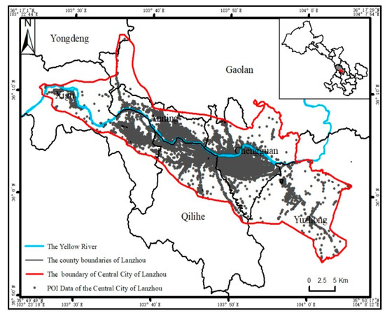 The study of urban spatial structure is currently one of the most popular research fields in urban geography [1]. In the process of changes to urban spatial allocation, a good urban spatial structure can promote the coordinated and sustainable development of the relationship between human beings and urban land [2]. However, the rapid development of a city can lead to many problems, such as the expansion of the urban scale without planning and a loose spatial structure. These will affect a number of major issues, such as the function of the city and the optimization of the industrial layout, further hindering a city’s sustainable development [3]. Since the 1990s, due to the rapid development of information technology, new items have been added to those factors that influence the urban spatial structure, such as knowledge and information, which enhance the traditional physical production factors such as land and labor [4]. Due to the arrival of the era of new data, an increasing amount of urban research is carried out by using a wide variety of geoscience new data. The applied data mainly focus on items such as the map POI (point of interest) data that describe the geospatial entities, GPS track data, and mobile phone signaling data related to crowd activities [5,6,7,8,9,10,11,12]. POI data, as a new spatial data source, have an important application potential. In this paper, POI refers to some geographical entity, which is closely related to human life. And in a geographic information system, POI can be a commercial outlet, a bus stop, a high-rise building, etc., which are more authentic. Therefore, POI data can largely enhance the capacity of the description of the physical location, reflect city activities, and can be effectively applied to the urban spatial structure research [13]. Compared with traditional data, POI data not only have the advantages of a large sample and easy access, but can also represent the spatial distribution of social and economic activity intensity and functional composite utilization, and reflect more accurately urban spatial structure [14,15]. In this context, research on the combination of traditional urban space and geographic new data is in urgent need of empirical enrichment and theoretical expansion. In this study, three methods are used to analyze the POI data, so as to explore the urban morphology and spatial structure of Lanzhou. The nearest-neighbor index can analyze whether the POI has agglomeration characteristics, and if so, what is the degree of this agglomeration [16]. The kernel density estimation (KDE) can analyze the spatial distribution characteristics of POI, where the distribution density is high and where is low [17]. The location entropy can analyze the proportion of a kind of POI to the total POI in the street, and then analyze whether this kind of POI has professional advantages at the street level [18]. Through the analysis of all POI in the city, the boundary of the city can be identified and the urban development morphology can be recognized, and the urban spatial structure can be summarized.