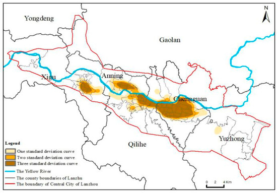 Based on the overall POI data of the central urban area, a kernel density analysis was carried out with a radius of 1400 m. The standard deviation surface (Figure 3) was obtained by using one standard deviation curve, two standard deviation curves, and three standard deviation curves as threshold values. The urban center areas outlined by the three standard deviation curves are sequentially divided into urban core areas, urban central areas, and urban development areas. The area formed by the three standard deviations’ surfaces covers 71% of the POI in the central urban area, with 6% of the land area; thus three standard deviation curves are finally selected as the city center boundary. In addition, considering that the Chengguan district has far more land area and POI than other districts in the central area of the city, and combining with the urban development process of Lanzhou, it is further determined that streets such as Linxia Road, Zhangye Road and Guangwumen Road in the Chengguan district are the city’s main centers, and the Jianlan Road in the Qilihe district and the streets of Kongjiaya and Peili in the Anning District are the city’s subcenters.