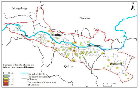 The nearest-neighbor index of the primary industry in the central urban area of Lanzhou is 0.651 (p < 0.01), which indicates that its spatial distribution has certain central agglomeration characteristics, but the central agglomeration distribution is not obvious. The results of the kernel density analysis (Figure 5) show that, without considering the its scale, the primary industry in the central urban area of Lanzhou is mostly distributed at the edge of the city’s built-up area, among which Xiguoyuan Street and the Weiling township in the Qilihe district are relatively concentrated, and the distribution characteristics of the large dispersion and small central agglomeration are obvious.