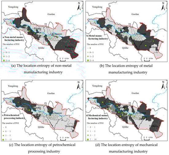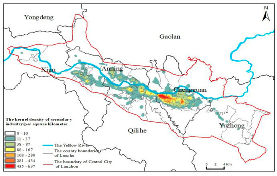 The results of the kernel density analysis show that the overall kernel density of all industries in the secondary industry is not high, and the trend of density diffusion along the gradient is not significant, with most of them presenting a small-scale central agglomeration distribution. The non-metallic, metallic, petrochemical, and mechanical industry elements have a high concentration distribution in the areas on the periphery of the central city. Furthermore, the petrochemical processing enterprises are mostly concentrated in the Xigu District, while the mechanical manufacturing enterprises are widely distributed. The pharmaceutical, architectural, advertising and decoration industry elements in the central area of the central city have a more concentrated distribution.