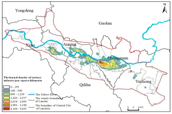 The urban economic geographical elements generally present the distribution trend of center agglomeration. In respect of spatial distribution, the economic geographical elements in the central urban area of Lanzhou have obvious characteristics of central agglomeration. Many industrial elements have large-scale agglomeration centers, which have formed specialized functional areas. There is a clear “central-peripheral” difference distribution in space, with an obvious circular structure. Generally, tertiary industry is distributed in the central area, and secondary industry is distributed in the peripheral areas.