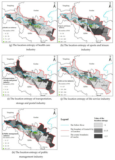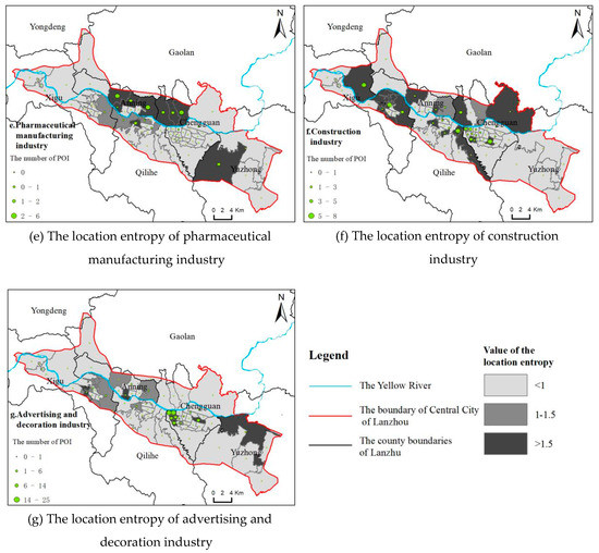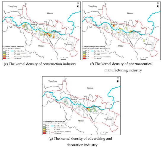 The results of the kernel density analysis of each industry in the secondary industry are shown in Figure 8. The density value of metal manufacturing elements is between 0 and 4 points per square kilometer, which are distributed in the central urban area but in a small number, and form an aggregation distribution in Yuzhong county. The density value of non-metal manufacturing elements is between 0 and 6 points per square kilometer, and there are more distributions in the central urban area, but it does not reflect the contiguous distribution. The density value of mechanical manufacturing industry elements is between 0 and 16 points per square kilometer, and is concentrated in Xigu district, Qilihe district and Anning district. The density value of petrochemical processing industry elements is between 0 and 8 points per square kilometer, which is mostly concentrated in Xigu district and has formed a high-density contiguous cluster distribution area. The density value of construction industry elements is between 0 and 10 points per square kilometer, which mainly presents a significant polycentric aggregation distribution in the south bank of the Yellow River in the central city. The density value of pharmaceutical manufacturing elements is between 0 and 7 points per square kilometer, which is mainly distributed in Chengguan district. The density value of advertising decoration industry elements is between 0 and 50 points per square kilometer, and the high-density area is mainly in the Chengguan district.