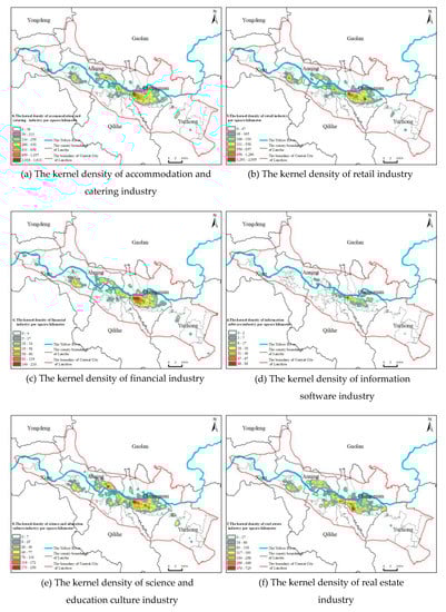 It can be seen from the results of the kernel density analysis that the healthcare industry has a high concentration distribution in the subcenter of the central city. The transportation, storage, and postal industries are highly concentrated in the area connecting the Qilihe and Xigu districts. The rest of the industries are highly concentrated in the main center of the central city, with the information software industry having the smallest distribution.