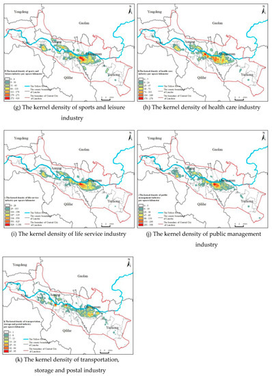 The results of the kernel density analysis of each industry in the tertiary industry are shown in Figure 9. The density value of accommodation and catering industry elements is between 0 and 1613 points per square kilometer, and the distribution characteristics of a single main center and multiple subcenters are obvious. The density value of retail industry elements is between 0 and 2005 points per square kilometer, with obvious multicenter layout, and the highest density value is located in Chengguan district. The density value of financial industry elements is between 0 and 210 points per square kilometer, which is mainly distributed in Chengguan district. The density value of information software industry elements is between 0 and 88 points per square kilometer, which has an obvious single-center layout and significant “center–periphery” difference. The density value of science and education culture industry elements is between 0 and 250 points per square kilometer, and the highest density value is located in Anning district and Chengguan district. The density value of real estate industry elements is between 0 and 725 points per square kilometer, which has obvious spatial structure characteristics with a single main center and multiple subcenters, and the highest density value is located in Chengguan district. The density value of sports and leisure industry elements is between 0 and 424 points per square kilometer, and the core distribution is located in Chengguan district. The density value of health care industry elements is between 0 and 278 points per square kilometer, which has an obvious single main center, and the highest density value is mainly located in Qilihe district. The density value of life service industry elements is between 0 and 1188 points per square kilometer, which has an obvious single main center, and the highest density value is located in Chengguan district. The density value of public management industry elements is between 0 and 308 points per square kilometer, which has an obvious single main center, and the core distribution area is Chengguan district. The density value of transportation, storage, and postal industry elements is between 0 and 95 points per square kilometer, which is concentrated in a small area of Qilihe district.