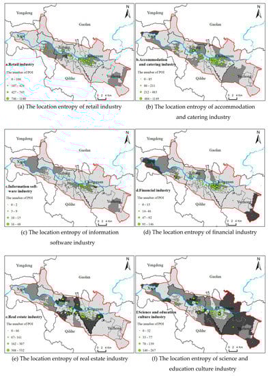 where Q is the location entropy, is the ratio of the number of elements of industry A in region K to the number of all elements of industry A in the whole area, and is the ratio of the total number of elements in the area K to the total number of elements in the whole area. Generally speaking, when Q < 1, it shows that the level of industry specialization of a street is lower than the average level of the region; when Q > 1, it indicates that the level of industry specialization of a street is higher than the average level of the region; and when Q > 1.5, it indicates that a street’s industry has significant specialization advantages throughout the region.