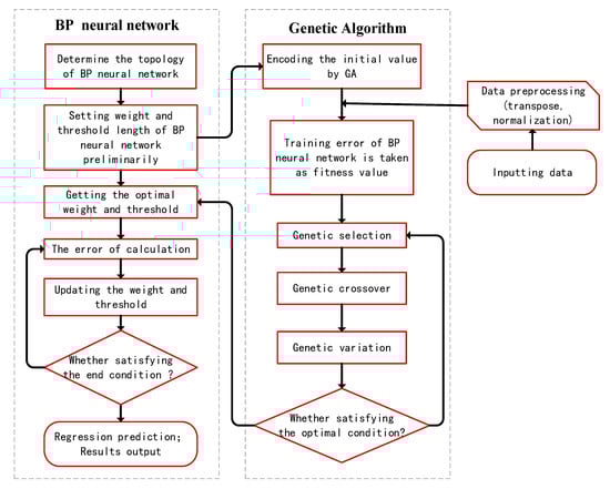 The GA optimized BP neural network consists of three parts: determination of topology structure of the BP neural network; optimization of the genetic algorithm and searching for parameters; and training and prediction of the BP neural network. The BP neural network topology is determined according to the number of input and output parameters in actual engineering problems, and then the length of individual sections (chromosomes) of the genetic algorithm is determined. The BP neural network parameters were initialized, and the weight and threshold were obtained after GA optimization. In this case, each chromosome in the population contained all weights and thresholds of the network. The fitness value of individuals is calculated by the fitness function, and the genetic algorithm finds the optimal fitness value of individuals by selecting, crossing, and mutating. The BP neural network uses the optimal individual to assign a value to the network weight threshold and train the network. The algorithm flow chart corresponding to the output prediction result is shown in Figure 1.