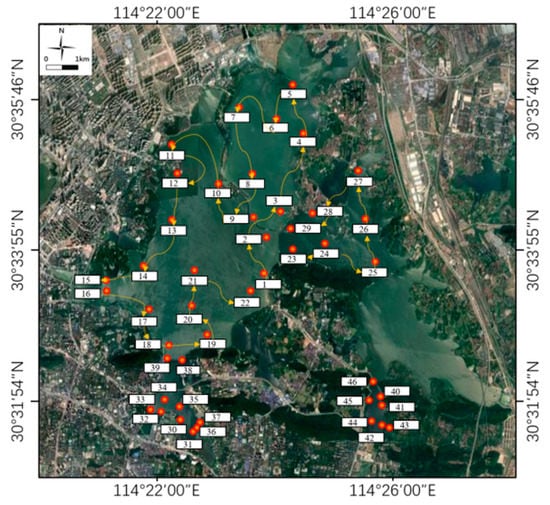 Located to the south of the Yangtze River in Wuhan Hubei Province (30°33′33.0″ N, 114°24′38.5″ E), Lake Donghu is one of the largest urban lakes in China, having both abundant rainfall and sunshine []. The dimensions of the Donghu Lake are as follows: the basin area is 187 km2, the lake surface area is 34.27 km2; the lake length is 11.3 km; the largest lake width is 10.3 km; the shoreline length is 121.7 km; the maximum water depth is 4.75 m; the average water depth is 2.21 m, and the total volume of the lake is about 6.2 million m3.