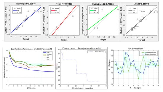 The genetic algorithm was terminated in the 50th generation (see Figure 1). The error value decreased gradually, and the fitness value of the corresponding optimal individual was 2.47. Fitness is used to evaluate the quality of an individual, and the more fit the individual, the better. The model achieved the best fitting effect at the 15th iteration, and the corresponding minimum MSE was 0.055. The total correlation coefficient (R) of the model reached 0.869, and the simulation effect was good.