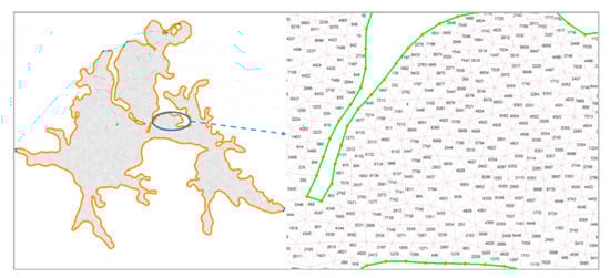 In this study, an unstructured triangular mesh was used to divide the terrain area of Donghu Lake. The specific division process included the selection of a simulation area, the determination of the terrain grid resolution, the definition of the open boundary in the land boundary, mesh generation, smoothing, and the calculation of the terrain difference. The result of the triangular mesh division is shown in Figure 6.