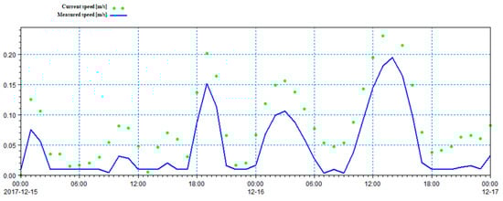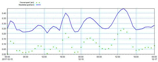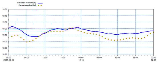 After the above parameters were set, the hydrodynamic numerical model was run, and the results output in 2d plane sequence file format (DFSU). The MIKE data extraction tool was used to extract information on the specified verification point from the output result for model validation and parameter calibration. The water outlet of the Xin ditch in Donghu Lake was selected as the verification point. The water level and velocity values measured at the selected site were verified (referring to the data published by Hubei hydrology bureau), and the MIKE plot composing tool was used for statistical analysis. The results are shown in Figure 7.