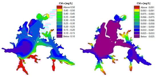 Comparison of chlorophyll a simulation results before (left) and after (right) parameter calibration.