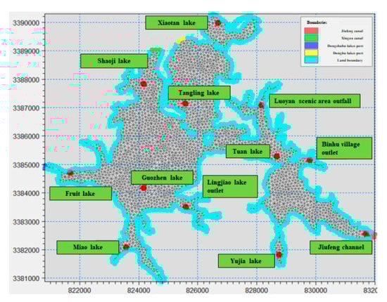 The corresponding locations of the above-mentioned places were set as the open boundary. Donghu port and the Dongshahu canal were set as the open boundary of the inlet water (Code values of 2 and 3), and the Jiufeng canal and the Xin ditch were set as the open boundary of the outlet water (Code values of 4 and 5). The initial conditions were set for each triangular mesh in the simulation of the hydrodynamic model.