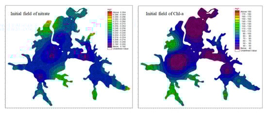 Based on the completed hydrodynamic model (FM), modelling WQ with nutrients and chlorophyll, a template of the ECO Lab water quality model was added. Chlorophyll a, nitrate nitrogen and nitrite were selected as the main indicators for water quality simulation. The simulation started on 15 November 2017, with a time step of 2 h and an interval of 384 steps. Among them, the setting of the pollutant diffusion and degradation coefficients, as well as some constant parameters and force parameters, refer to historical empirical values []; the specific values are shown in Table 4.