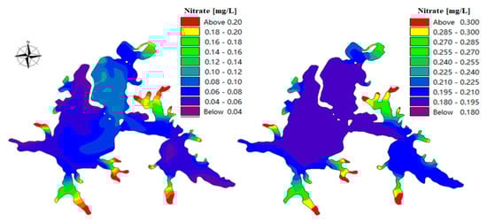Comparison of nitrate simulation results based (left) and not based (right) on remote sensing optimization.