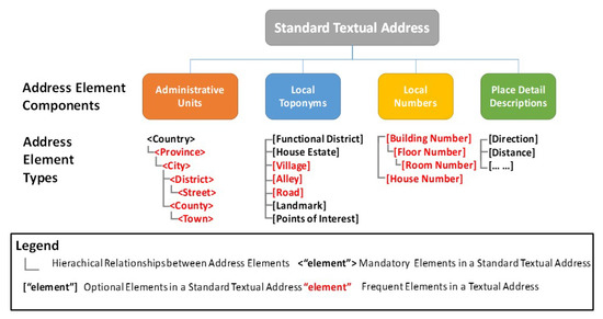 where ei and ej refer to address elements and can be regarded as the minimum spatial semantic primitive that indicates a geographical entity (such as a road, a building or a landmark and so on). R represents the spatial constraint relationship between Chinese address elements [5]. According to “Chinese National Standard GB/T 23705-2009” [10], the components and organization rules for Chinese address element types are presented in Figure 1.