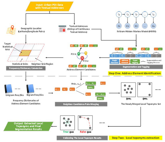 In this section, we propose a local spatial context-based framework to extract local toponyms and segment Chinese textual addresses from urban POI data. Proposed workflow for the proposed framework is illustrated in Figure 3. First, urban POIs with textual addresses are collected as an input data source; then, using the textual address and N-Gram hidden Markov model (HMM), address element candidates can be identified, and by using the local toponym spatial distribution patterns, the newly local toponyms set can be merged and true local toponyms can be validated and extracted. Finally, given these extracted true local toponyms, higher precision results of the textual address segmentation task can be achieved.