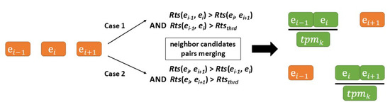 After calculating the relatedness value, whether the neighboring candidates should be merged is determined by a threshold value, Rtsthrd. The strategy of neighbor candidates pairs merging is depicted in Figure 8 and by Algorithm 2, the merging neighboring candidate pairs function. Algorithm 2 shows the normal direction (from left to right, starting from the first address element candidates) of neighbor candidate pair-merging when calculating the relatedness value. We also tested other approaches, such as the reverse direction (from right to left, starting from the last address element candidates) and both directions (calculating the Rts values in both directions and choosing the larger result). Overall, which approach should be used as the final approach when calculating the relatedness value is determined empirically. We will present the empirical comparisons of these approaches in Section 4.
