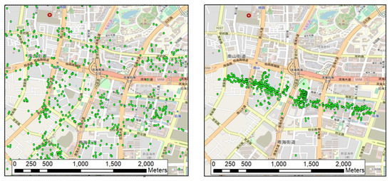 We start the evaluation by obtaining a well-segmented ground-truth dataset. Approximately 10,000 POIs with textual addresses randomly selected from the study area were manually segmented by a human parser. The POI selection strategy is based on the spatial distribution of POIs. We first divided the entire study area into grids with 500 m cell size and counted the number of POIs in each cell. Then, the number of POIs that should be selected from each grid was calculated based on Equation (8):