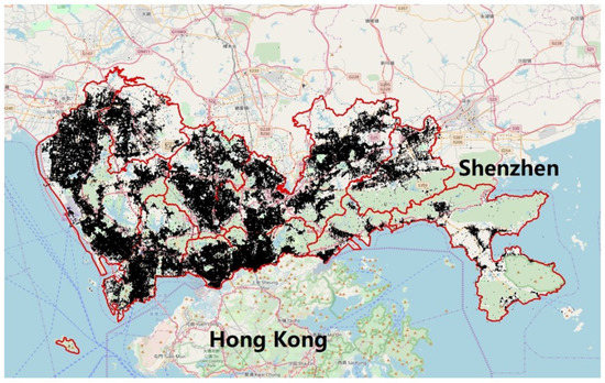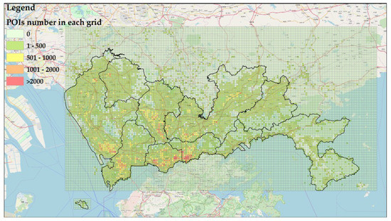 Nselected(gi) is the number of POIs that should be selected from grid-i, and Nselected(total) is the total number of POIs obtained for the ground-truth dataset. Here, Nselected(total) is 10,000, Ngi is the total number of POIs within grid-cell i and Ntotal is the total number of POIs within the whole study area. The POI distributions of each grid within the entire study area are shown in Figure 12.